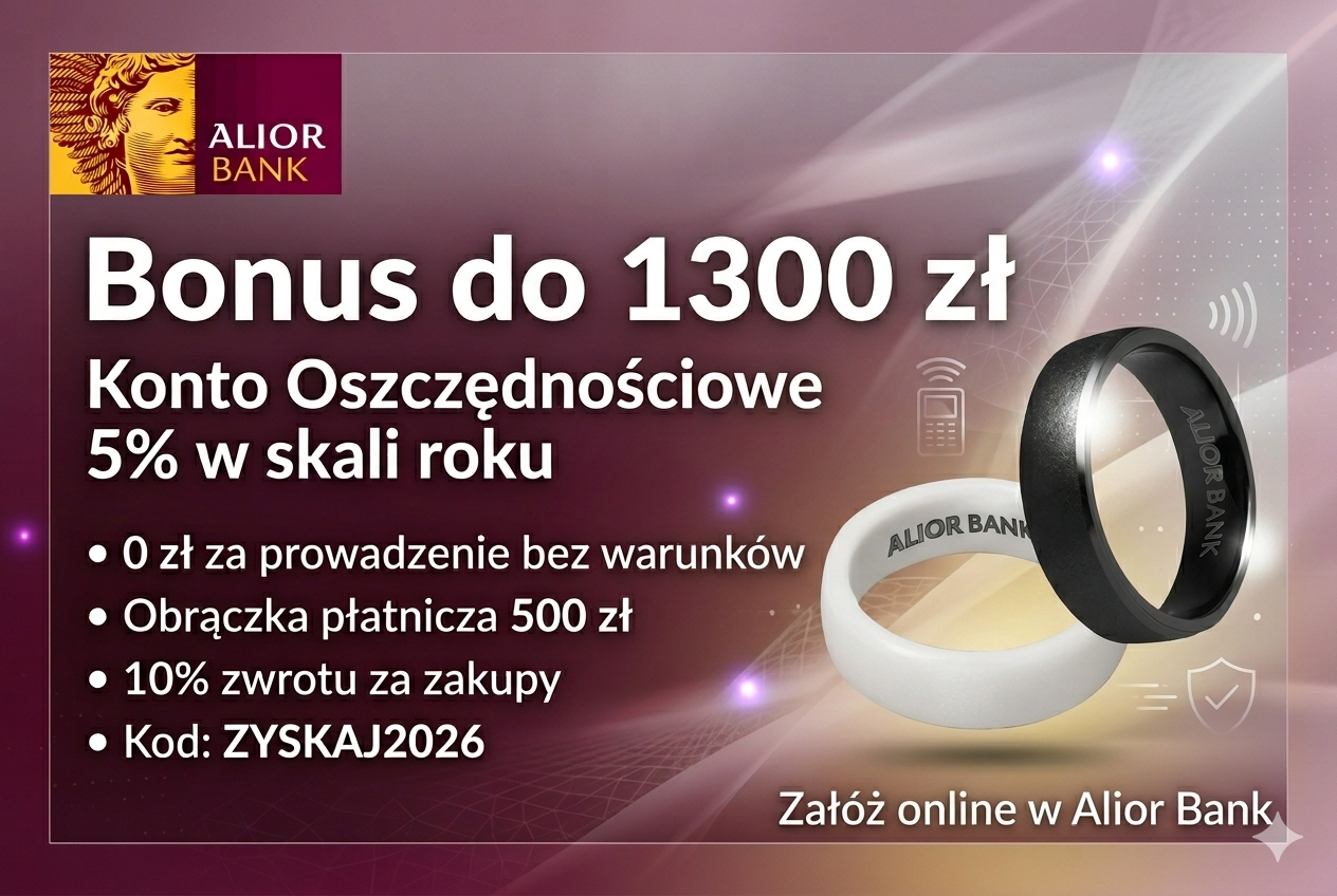 PromoBank 0 Report post Posted 14 hours ago Alior Konto to obecnie jedna z najatrakcyjniejszych ofert na rynku! Nowi klienci mogą zgarnąć nawet 1300 zł premii z kodem ZYSKAJ2026 (ważny do 31.08.2026). W tym: 500 zł w formie obrączki płatniczej Mastercard – wystarczy 5 transakcji kartą lub BLIKiem w ciągu 10 dni + zalogowanie do aplikacji Alior Mobile + zapis do programu Bezcenne Chwile 800 zł zwrotu za zakupy stacjonarne (10% wartości, max 100 zł miesięcznie przez 8 miesięcy) przy wpływie min. 2000 zł z innego banku Dodatkowo: 0 zł za prowadzenie konta – bez żadnych warunków 0 zł za obsługę karty przy 5 transakcjach miesięcznie 0 zł za wypłaty z bankomatów własnych i Euronet od 100 zł Konto Oszczędnościowe na Start z oprocentowaniem 5% w skali roku przez 4 miesiące (do 50 000 zł) Pełna wygoda: aplikacja Alior Mobile, BLIK, Google Pay, Apple Pay i szybka weryfikacja online Chcesz skorzystać? Załóż Alior Konto teraz i odbierz premię! Sprawdź wszystkie aktualne promocje kont osobistych → https://promocjebankowe.site/finanse-osobiste/konta-osobiste/ Share this post Link to post Share on other sites